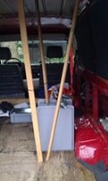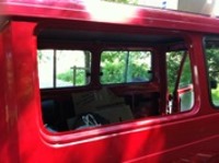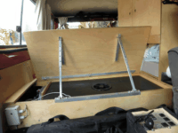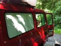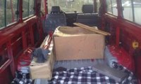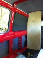 Als erstes reissen wir mehrere Kilo Kabel und Innenverkleidungen heraus. Als "Himmel" kleben wir einen normalen Spannteppich unters Dach.Der gesamte Innenausbau steht auf einer mit Phenolharz beschichteten Birkensperrholzplatte mit der Siebdruckoberfläche nach oben, so haben wir einen "griffigen" Boden. Das Schiebefenster vorne links tauschen wir mit einem Alublech aus, denn dahinter wird einmal der Kleiderschrank seinen Platz bekommen.